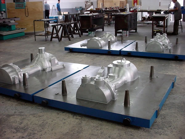 Os modelos de alumínio, nossa maior produção, são geralmente solicitados por nossos clientes quando precisam de uma tiragem maior de peças, pois são mais precisos e duráveis do que os modelos de madeira. O projeto é totalmente CAD/CAM. Um modelo de isopor do produto é feito, fundido e devolvido à nossa fábrica para a usinagem final em nossas máquinas CNC. Os componentes do projeto são finalizados e montados manualmente, bem como verificados quanto às dimensões, aprovados e entregues ao cliente. Para esses projetos mais complexos, nosso Diretor Técnico de Vendas faz visitas de acompanhamento aos clientes para garantir que o modelo funcionará corretamente na fundição que o utilizará. Contatos posteriores também são feitos para acompanhar o modelo até que ele seja aprovado para produção contínua. Os modelos de ferro fundido também são fabricados da mesma forma que os de alumínio, mas são mais duráveis para uma demanda maior de produção. Às vezes, dependendo da complexidade das peças, elas são usinadas diretamente dos blocos de ferro fundido, sem a necessidade de fundição.